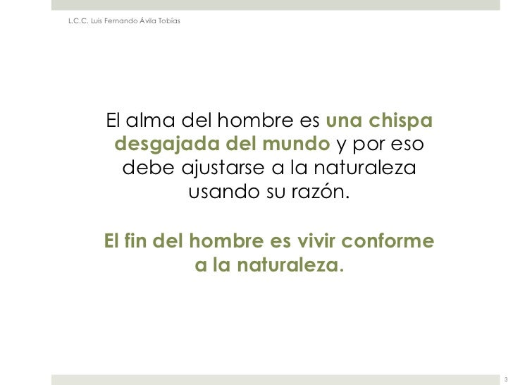 2. 2. L.C.C. Luis Fernando Ávila Tobías El alma del hombre es una chispa desgajada del mundo y por eso debe ajustarse a la naturaleza usando su razón. El fin del hombre es vivir conforme a la naturaleza. 3