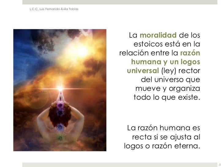 4. 4. L.C.C. Luis Fernando Ávila Tobías La moralidad de los estoicos está en la relación entre la razón humana y un logos universal (ley) rector del universo que mueve y organiza todo lo que existe. La razón humana es recta si se ajusta al logos o razón eterna. 5