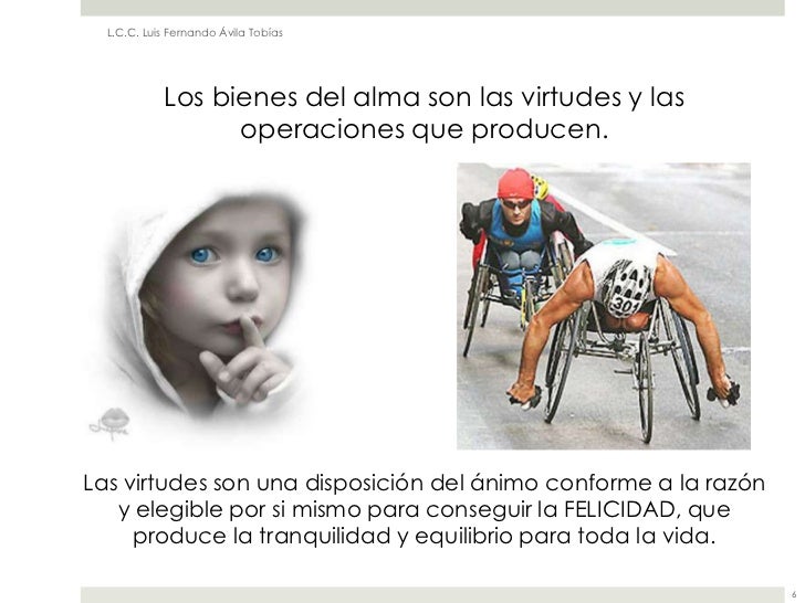 5. 5. L.C.C. Luis Fernando Ávila Tobías Los bienes del alma son las virtudes y las operaciones que producen.Las virtudes son una disposición del ánimo conforme a la razón y elegible por si mismo para conseguir la FELICIDAD, que produce la tranquilidad y equilibrio para toda la vida. 6