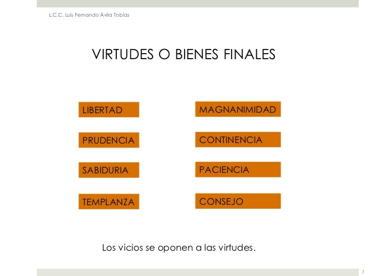 6. 6. L.C.C. Luis Fernando Ávila Tobías VIRTUDES O BIENES FINALES LIBERTAD MAGNANIMIDAD PRUDENCIA CONTINENCIA SABIDURIA PACIENCIA TEMPLANZA CONSEJO Los vicios se oponen a las virtudes. 7
