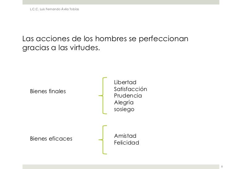 7. 7. L.C.C. Luis Fernando Ávila TobíasLas acciones de los hombres se perfeccionangracias a las virtudes. Libertad Bienes finales Satisfacción Prudencia Alegría sosiego Bienes eficaces Amistad Felicidad 8