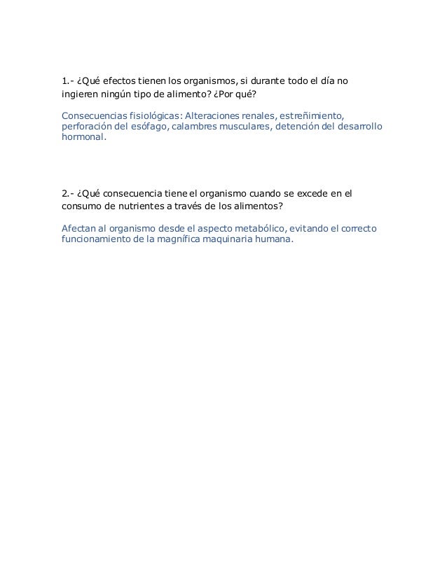 2. 2. 1.- ¿Qué efectos tienen los organismos, si durante todo el día no ingieren ningún tipo de alimento? ¿Por qué? Consecuencias fisiológicas: Alteraciones renales, estreñimiento, perforación del esófago, calambres musculares, detención del desarrollo hormonal. 2.- ¿Qué consecuencia tiene el organismo cuando se excede en el consumo de nutrientes a través de los alimentos? Afectan al organismo desde el aspecto metabólico, evitando el correcto funcionamiento de la magnífica maquinaria humana.