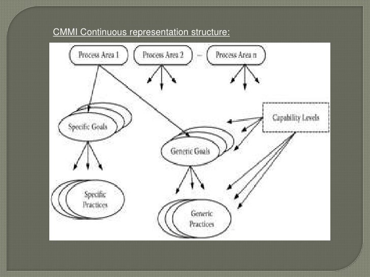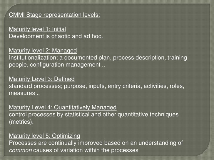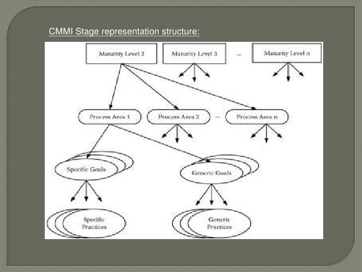 4. 4. Practices</li></li></ul><li>CMMI Stage representation levels:<br />Maturity level 1: InitialDevelopment is chaotic and ad hoc. <br />Maturity level 2: Managed Institutionalization; a documented plan, process description, training people, configuration management .. <br />Maturity Level 3: Defined standard processes; purpose, inputs, entry criteria, activities, roles, measures ..<br />Maturity Level 4: Quantitatively Managed control processes by statistical and other quantitative techniques (metrics). <br />Maturity level 5: Optimizing Processes are continually improved based on an understanding of common causes of variation within the processes <br />