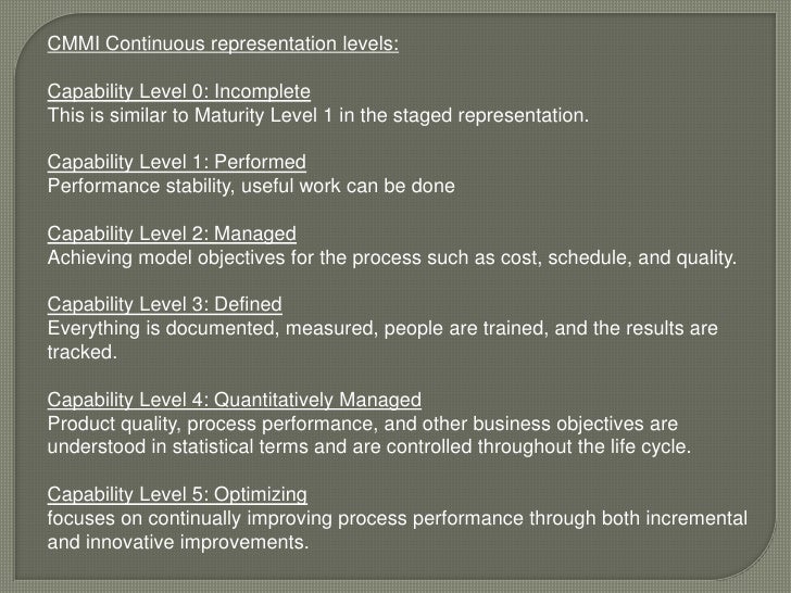 7. 7. CMMI Continuous representation levels:<br />Capability Level 0: Incomplete<br />This is similar to Maturity Level 1 in the staged representation.<br />Capability Level 1: Performed<br />Performance stability, useful work can be done<br />Capability Level 2: Managed<br />Achieving model objectives for the process such as cost, schedule, and quality.<br />Capability Level 3: Defined<br />Everything is documented, measured, people are trained, and the results are tracked.<br />Capability Level 4: Quantitatively Managed<br />Product quality, process performance, and other business objectives are understood in statistical terms and are controlled throughout the life cycle.<br />Capability Level 5: Optimizing<br />focuses on continually improving process performance through both incremental and innovative improvements.<br />