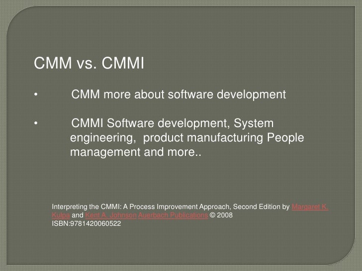 9. 9. CMMI Software development, System engineering, product manufacturing People management and more..</li></ul>Interpreting the CMMI: A Process Improvement Approach, Second Edition by Margaret K. Kulpa and Kent A. Johnson Auerbach Publications © 2008 <br />ISBN:9781420060522<br />
