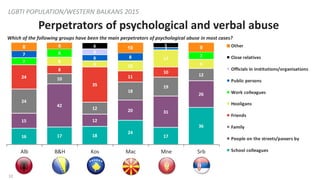 10. 10. 10 Perpetrators of psychological and verbal abuse LGBTI POPULATION/WESTERN BALKANS 2015 16 17 18 24 17 36 15 42 12 20 31 26 24 10 12 18 19 1224 8 35 11 10 8 6 10 17 9 7 8 77 6 8 2 6 6 58 6 10 9 Alb B&H Kos Mac Mne Srb Other Close relatives Officials in institutions/organisations Public persons Work colleagues Hooligans Friends Family People on the streets/passers by School colleagues Which of the following groups have been the main perpetrators of psychological abuse in most cases?