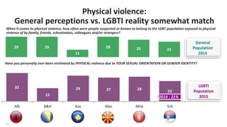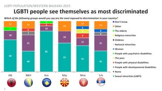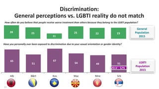8. 8. 8 LGBTI people see themselves as most discriminated LGBTI POPULATION/WESTERN BALKANS 2015 63 40 81 57 51 41 18 31 10 24 15 31 7 6 6 5 9 8 7 5 6 6 12 14 20 10 16 Alb B&H Kos Mac Mne Srb Don’t know Other The elderly Religious minorities Children National minorities Women People with psychiatric disabilities The poor People with physical disabilities People with developmental disabilities Roma Sexual minorities (LGBTI) Which of the following groups would you say are the most exposed to discrimination in your country?