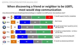15. 15. 15 If their child were LGBTI, most would try to “cure” them. GENERAL POPULATION/WESTERN BALKANS 2015 6 8 3 5 8 12 11 18 22 8 11 15 10 5 7 12 10 44 41 58 47 48 12 11 9 10 9 7 12 7 15 8 11 7 6 2 6 3 2 1 10 42Alb B&H Kos Mac Mne Srb I would support him/her completely Don't know I would accept it but I would try to make sure that no one else finds out that except our family I would try to help him/her – to find a cure for that I would stop communicating with him/her I would made him/her leave our family house I would use physical punishment If you would find out that your child is a homosexual (previously mentioned LGBTI person), how would you react?