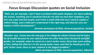 17. 17. 17 “Well, me, for example, I don’t have a problem with public displays, nor them walking the streets, anything, but it would be hard for me that my next door neighbors, are, let’s say a gay married couple, and I have a small child and now I need to explain a million things, and a child can’t understand it the right way, and that for sure can impact a child’s development.” (Female participant of FGDs, General population, Serbia) “Another guy I know was the only gay in his village for whom it knew and he had a lot of trouble because he was rejected from the other boys from the fourth and fifth grades. For example, when he comes in a men’s locker room, those boys were yelling at him, telling him that he is in the wrong locker room, and that he should go to the girls’ locker room. Peers or peer violence is the biggest problem.” (Male participant of FGDs, General population, Albania) Focus Groups Discussion quotes on Social Inclusion GENERAL POPULATION/WESTERN BALKANS 2015
