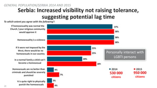19. 19. 19 Personal contact reduces prejudice and stereotypes GENERAL POPULATION/WESTERN BALKANS 2015 Now I am going to read to you some statements and I would like you to tell me to which extent you agree with each of them: 58% 58% 54% 52% 50% 49% 45% 25% 25% 19% 78% 85% 50% 47% 77% 41% 51% 31% 24% 12% 13% 63%I don’t have anything against homosexuals, but they shouldn't exhibit their sexual orientation outside of their homes. Homosexuality has existed always, it is not a phenomenon that has been made up recently Homosexuality is a sickness If homosexuality was normal the Church / your religious community would approve it Homosexuals are citizens as much as everybody else In a normal family a child can't become a homosexual Tolerance of differencies have gone to other extreme and now members of minorities have more rights than the rest If it were not imposed by the West, there would be no homosexuals in our country Transgender persons work only in prostitution Homosexuals are no better than criminals and should be severely punished It is quite right to physically punish the homosexuals General Population average for Western Balkans Personally interact with LGBTI persons