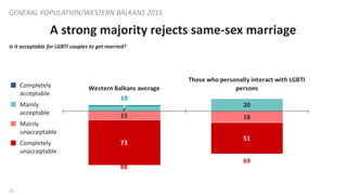 21. 21. 21 15 18 73 51 88 69 7 203 10 Western Balkans average Those who personally interact with LGBTI persons A strong majority rejects same-sex marriage GENERAL POPULATION/WESTERN BALKANS 2015  Completely acceptable  Mainly acceptable  Mainly unacceptable  Completely unacceptable Is it acceptable for LGBTI couples to get married?