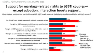 22. 22. 22 Support for marriage-related rights to LGBTI couples— except adoption. Interaction boosts support. GENERAL POPULATION/WESTERN BALKANS 2015 Please indicate whether or not you think it acceptable LGBTI people to exercise the following based on cohabitation with their partners? 32% 30% 30% 29% 29% 10% 67% 59% 60% 58% 51% 57% 26% 39% The right of LGBTI people to visit their patner in hospital or prison The right of LGBTI people to health insurance based on their partner’s insurance The right of LGBTI people to be treated as next of kin in the event of partner’s incapacity or death The right to automatically inherit their partner’s possessions in the event of their partner’s death The right to legal action related to division of property & assets should their partnership be dissolved The right of LGBTI people to inherit partner’s pension in the event of their partner’s death The right of LGBTI people to adopt children General Population average for Western Balkans Personally interact with LGBTI persons