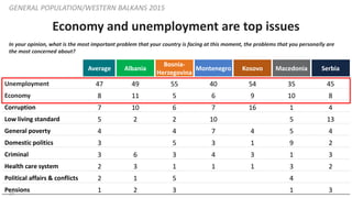 24. 24. 24 Economy and unemployment are top issues GENERAL POPULATION/WESTERN BALKANS 2015 In your opinion, what is the most important problem that your country is facing at this moment, the problems that you personally are the most concerned about? Average Albania Bosnia- Herzegovina Montenegro Kosovo Macedonia Serbia Unemployment 47 49 55 40 54 35 45 Economy 8 11 5 6 9 10 8 Corruption 7 10 6 7 16 1 4 Low living standard 5 2 2 10 5 13 General poverty 4 4 7 4 5 4 Domestic politics 3 5 3 1 9 2 Criminal 3 6 3 4 3 1 3 Health care system 2 3 1 1 1 3 2 Political affairs & conflicts 2 1 5 4 Pensions 1 2 3 1 3