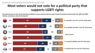 25. 25. 25 Most voters would not vote for a political party that supports LGBTI rights GENERAL POPULATION/WESTERN BALKANS 2015 58 52 60 61 49 47 18 15 10 17 20 17 8 16 18 5 10 14 10 10 9 12 13 14 5 6 3 6 8 8 Alb B&H Kos Mac Mne Srb I wouldn’t vote for sure for that party I probably wouldn’t vote for that party Don't know I would probably vote for that party I would vote for sure for that party If a party focuses on the most important problem in your country and also says it wants to protect and promote the rights of LGBTI citizens, would you vote for that party?