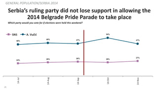 26. 26. 26 Serbia’s ruling party did not lose support in allowing the 2014 Belgrade Pride Parade to take place GENERAL POPULATION/SERBIA 2014 24% 26% 26% 26% 27% 46% 48% 47% 54% 47% 14-Jul 14-Aug 14-Sep 14-Oct 14-Nov SNS A. Vučić Which party would you vote for if elections were held this weekend?