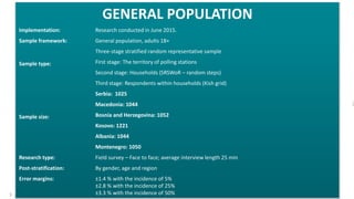 3. 3. 3 GENERAL POPULATION Implementation: Research conducted in June 2015. Sample framework: General population, adults 18+ Sample type: Three-stage stratified random representative sample First stage: The territory of polling stations Second stage: Households (SRSWoR – random steps) Third stage: Respondents within households (Kish grid) Sample size: Serbia: 1025 Macedonia: 1044 Bosnia and Herzegovina: 1052 Kosovo: 1221 Albania: 1044 Montenegro: 1050 Research type: Field survey – Face to face; average interview length 25 min Post-stratification: By gender, age and region Error margins: ±1.4 % with the incidence of 5% ±2.8 % with the incidence of 25% ±3.3 % with the incidence of 50%