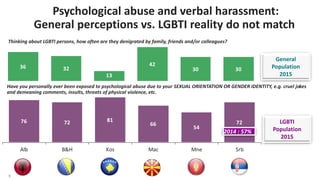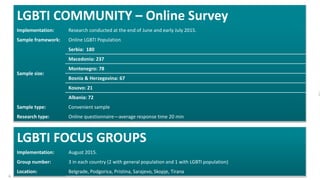 4. 4. 4 LGBTI COMMUNITY – Online Survey Implementation: Research conducted at the end of June and early July 2015. Sample framework: Online LGBTI Population Sample size: Serbia: 180 Macedonia: 237 Montenegro: 78 Bosnia & Herzegovina: 67 Kosovo: 21 Albania: 72 Sample type: Convenient sample Research type: Online questionnaire—average response time 20 min LGBTI FOCUS GROUPS Implementation: August 2015. Group number: 3 in each country (2 with general population and 1 with LGBTI population) Location: Belgrade, Podgorica, Pristina, Sarajevo, Skopje, Tirana