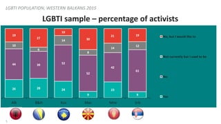 5. 5. 5 LGBTI sample – percentage of activists LGBTI POPULATION, WESTERN BALKANS 2015 26 28 24 9 23 9 44 39 52 52 42 61 10 6 14 8 14 12 19 27 10 30 21 19 Alb B&H Kos Mac Mne Srb No, but I would like to Not currently but I used to be No Yes