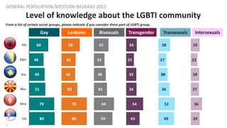 7. 7. 7 Level of knowledge about the LGBTI community GENERAL POPULATION/WESTERN BALKANS 2015 Gay Lesbians Bisexuals Transgender Transexuals Intersexuals 60 46 49 51 79 80 58 45 44 50 79 80 47 35 38 42 64 59 34 25 33 34 54 43 49 52 36 30 27 38 29 36 27 28 22 29Alb B&H Kos Mac Mne Srb From a list of certain social groups, please indicate if you consider them part of LGBTI group.