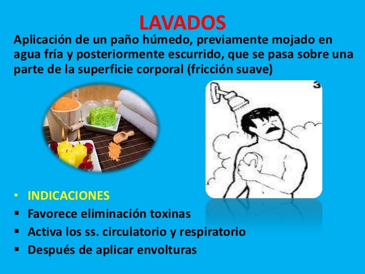 1. 1. LAVADOSAplicación de un paño húmedo, previamente mojado enagua fría y posteriormente escurrido, que se pasa sobre unaparte de la superficie corporal (fricción suave)• INDICACIONES Favorece eliminación toxinas Activa los ss. circulatorio y respiratorio Después de aplicar envolturas