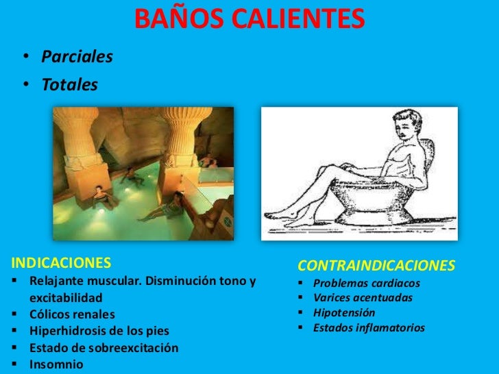 3. 3. BAÑOS CALIENTES • Parciales • TotalesINDICACIONES CONTRAINDICACIONES Relajante muscular. Disminución tono y  Problemas cardiacos excitabilidad  Varices acentuadas Cólicos renales  Hipotensión Hiperhidrosis de los pies  Estados inflamatorios Estado de sobreexcitación Insomnio