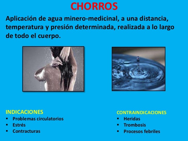6. 6. CHORROSAplicación de agua minero-medicinal, a una distancia,temperatura y presión determinada, realizada a lo largode todo el cuerpo.INDICACIONES CONTRAINDICACIONES Problemas circulatorios  Heridas Estrés  Trombosis Contracturas  Procesos febriles
