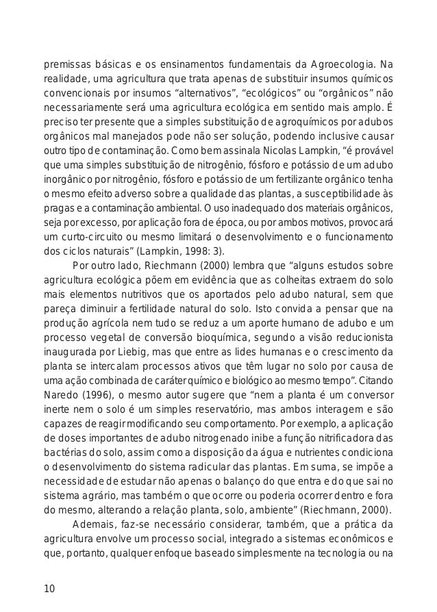 9. 9. 10 premissas básicas e os ensinamentos fundamentais da Agroecologia. Na realidade, uma agricultura que trata apenas de substituir insumos químicos convencionais por insumos “alternativos”, “ecológicos” ou “orgânicos” não necessariamente será uma agricultura ecológica em sentido mais amplo. É preciso ter presente que a simples substituição de agroquímicos por adubos orgânicos mal manejados pode não ser solução, podendo inclusive causar outro tipo de contaminação. Como bem assinala Nicolas Lampkin, “é provável que uma simples substituição de nitrogênio, fósforo e potássio de um adubo inorgânico por nitrogênio, fósforo e potássio de um fertilizante orgânico tenha o mesmo efeito adverso sobre a qualidade das plantas, a susceptibilidade às pragas e a contaminação ambiental. O uso inadequado dos materiais orgânicos, seja por excesso, por aplicação fora de época, ou por ambos motivos, provocará um curto-circuito ou mesmo limitará o desenvolvimento e o funcionamento dos ciclos naturais” (Lampkin, 1998: 3). Por outro lado, Riechmann (2000) lembra que “alguns estudos sobre agricultura ecológica põem em evidência que as colheitas extraem do solo mais elementos nutritivos que os aportados pelo adubo natural, sem que pareça diminuir a fertilidade natural do solo. Isto convida a pensar que na produção agrícola nem tudo se reduz a um aporte humano de adubo e um processo vegetal de conversão bioquímica, segundo a visão reducionista inaugurada por Liebig, mas que entre as lides humanas e o crescimento da planta se intercalam processos ativos que têm lugar no solo por causa de uma ação combinada de caráter químico e biológico ao mesmo tempo”. Citando Naredo (1996), o mesmo autor sugere que “nem a planta é um conversor inerte nem o solo é um simples reservatório, mas ambos interagem e são capazes de reagir modificando seu comportamento. Por exemplo, a aplicação de doses importantes de adubo nitrogenado inibe a função nitrificadora das bactérias do solo, assim como a disposição da água e nutrientes condiciona o desenvolvimento do sistema radicular das plantas. Em suma, se impõe a necessidade de estudar não apenas o balanço do que entra e do que sai no sistema agrário, mas também o que ocorre ou poderia ocorrer dentro e fora do mesmo, alterando a relação planta, solo, ambiente” (Riechmann, 2000). Ademais, faz-se necessário considerar, também, que a prática da agricultura envolve um processo social, integrado a sistemas econômicos e que, portanto, qualquer enfoque baseado simplesmente na tecnologia ou na