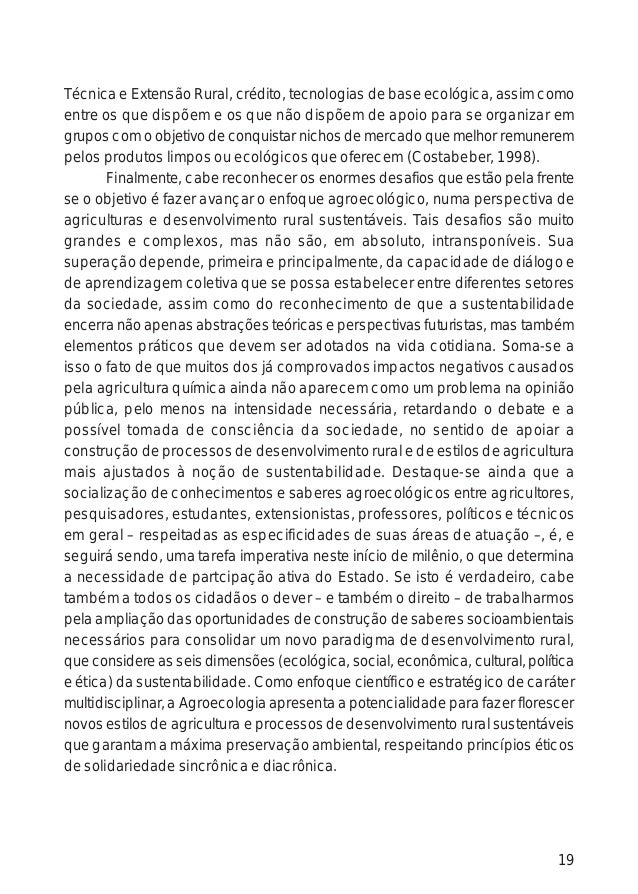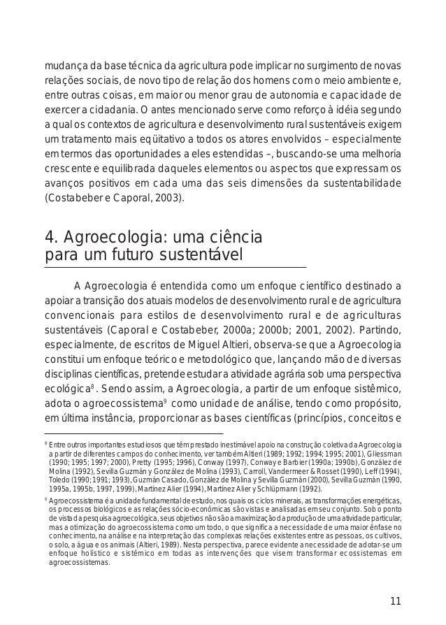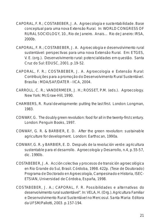 20. 20. 21 CAPORAL, F. R.; COSTABEBER, J. A. Agroecologia e sustentabilidade. Base conceptual para uma nova Extensão Rural. In: WORLD CONGRESS OF RURAL SOCIOLOGY, 10., Rio de Janeiro. Anais... Rio de Janeiro: IRSA, 2000b. CAPORAL, F. R.; COSTABEBER, J. A. Agroecologia e desenvolvimento rural sustentável: perspectivas para uma nova Extensão Rural. Em: ETGES, V. E. (org.). Desenvolvimento rural: potencialidades em questão. Santa Cruz do Sul: EDUSC, 2001. p.19-52. CAPORAL, F. R.; COSTABEBER, J. A. Agroecologia e Extensão Rural: Contribuições para a promoção do Desenvolvimento Rural Sustentável. Brasília : MDA/SAF/DATER - IICA, 2004. CARROLL, C. R.; VANDERMEER, J. H.; ROSSET, P.M. (eds.). Agroecology. New York: McGraw-Hill, 1990. CHAMBERS, R. Rural developmente: putting the last first. London: Longman, 1983. CONWAY, G. The doubly green revolution: food for all in the twenty-first century. London: Penguin Books, 1997. CONWAY, G. R. & BARBIER, E. D. After the green revolution: sustainable agriculture for development. London: Earthscan, 1990a. CONWAY, G. R. y BARBIER, E. D. Después de la revolución verde: agricultura sustentable para el desarrollo. Agroecología y Desarrollo, n.4, p.55-57, dic. 1990b. COSTABEBER, J. A. Acción colectiva y procesos de transición agroecológica en Rio Grande do Sul, Brasil. Córdoba, 1998. 422p. (Tese de Doutorado) Programa de Doctorado en Agroecología, Campesinado e Historia, ISEC- ETSIAN, Universidad de Córdoba, España, 1998. COSTABEBER, J. A.; CAPORAL, F. R. Possibilidades e alternativas do desenvolvimento rural sustentável”. In: VELA, H. (Org.). Agricultura Familiar e Desenvolvimento Rural Sustentável no Mercosul. Santa Maria: Editora da UFSM/Pallotti, 2003. p.157-194.
