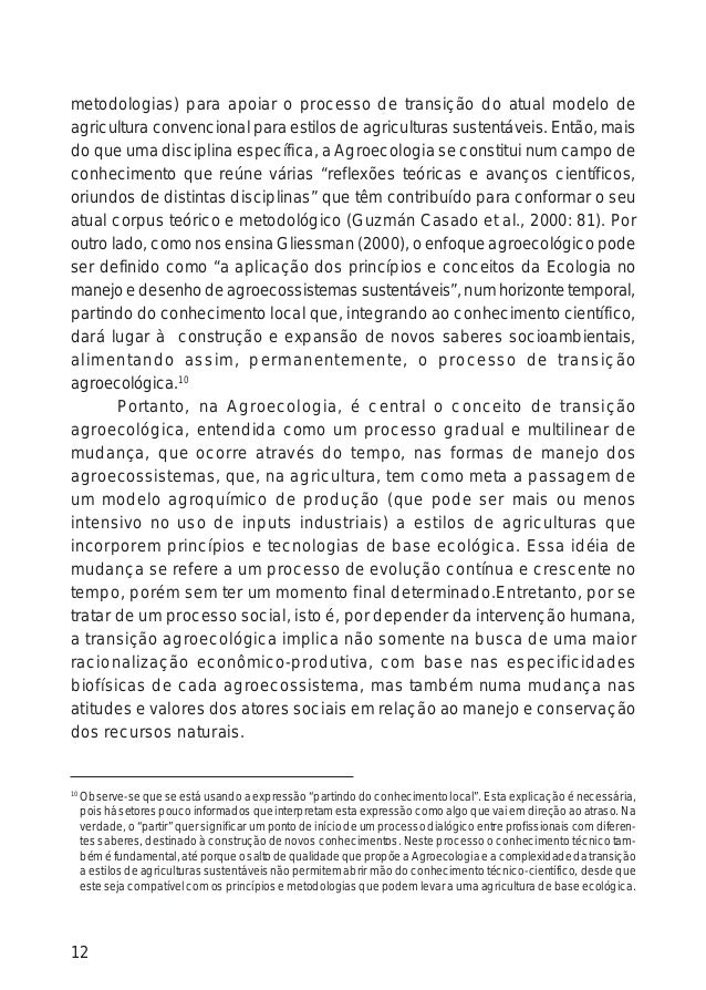 11. 11. 12 metodologias) para apoiar o processo de transição do atual modelo de agricultura convencional para estilos de agriculturas sustentáveis. Então, mais do que uma disciplina específica, a Agroecologia se constitui num campo de conhecimento que reúne várias “reflexões teóricas e avanços científicos, oriundos de distintas disciplinas” que têm contribuído para conformar o seu atual corpus teórico e metodológico (Guzmán Casado et al., 2000: 81). Por outro lado, como nos ensina Gliessman (2000), o enfoque agroecológico pode ser definido como “a aplicação dos princípios e conceitos da Ecologia no manejo e desenho de agroecossistemas sustentáveis”, num horizonte temporal, partindo do conhecimento local que, integrando ao conhecimento científico, dará lugar à construção e expansão de novos saberes socioambientais, alimentando assim, permanentemente, o processo de transição agroecológica.10 Portanto, na Agroecologia, é central o conceito de transição agroecológica, entendida como um processo gradual e multilinear de mudança, que ocorre através do tempo, nas formas de manejo dos agroecossistemas, que, na agricultura, tem como meta a passagem de um modelo agroquímico de produção (que pode ser mais ou menos intensivo no uso de inputs industriais) a estilos de agriculturas que incorporem princípios e tecnologias de base ecológica. Essa idéia de mudança se refere a um processo de evolução contínua e crescente no tempo, porém sem ter um momento final determinado.Entretanto, por se tratar de um processo social, isto é, por depender da intervenção humana, a transição agroecológica implica não somente na busca de uma maior racionalização econômico-produtiva, com base nas especificidades biofísicas de cada agroecossistema, mas também numa mudança nas atitudes e valores dos atores sociais em relação ao manejo e conservação dos recursos naturais. 10 Observe-se que se está usando a expressão “partindo do conhecimento local”. Esta explicação é necessária, pois há setores pouco informados que interpretam esta expressão como algo que vai em direção ao atraso. Na verdade, o “partir” quer significar um ponto de início de um processo dialógico entre profissionais com diferen- tes saberes, destinado à construção de novos conhecimentos. Neste processo o conhecimento técnico tam- bém é fundamental, até porque o salto de qualidade que propõe a Agroecologia e a complexidade da transição a estilos de agriculturas sustentáveis não permitem abrir mão do conhecimento técnico-científico, desde que este seja compatível com os princípios e metodologias que podem levar a uma agricultura de base ecológica.