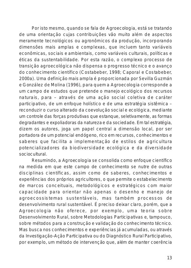 12. 12. 13 Por isto mesmo, quando se fala de Agroecologia, está se tratando de uma orientação cujas contribuições vão muito além de aspectos meramente tecnológicos ou agronômicos da produção, incorporando dimensões mais amplas e complexas, que incluem tanto variáveis econômicas, sociais e ambientais, como variáveis culturais, políticas e éticas da sustentabilidade. Por esta razão, o complexo processo de transição agroecológica não dispensa o progresso técnico e o avanço do conhecimento científico (Costabeber, 1998; Caporal e Costabeber, 2000a). Uma definição mais ampla é proporcionada por Sevilla Guzmán e González de Molina (1996), para quem a Agroecologia corresponde a um campo de estudos que pretende o manejo ecológico dos recursos naturais, para – através de uma ação social coletiva de caráter participativo, de um enfoque holístico e de uma estratégia sistêmica – reconduzir o curso alterado da coevolução social e ecológica, mediante um controle das forças produtivas que estanque, seletivamente, as formas degradantes e expoliadoras da natureza e da sociedade. Em tal estratégia, dizem os autores, joga um papel central a dimensão local, por ser portadora de um potencial endógeno, rico em recursos, conhecimentos e saberes que facilita a implementação de estilos de agricultura potencializadores da biodiversidade ecológica e da diversidade sociocultural. Resumindo, a Agroecologia se consolida como enfoque científico na medida em que este campo de conhecimento se nutre de outras disciplinas científicas, assim como de saberes, conhecimentos e experiências dos próprios agricultores, o que permite o estabelecimento de marcos conceituais, metodológicos e estratégicos com maior capacidade para orientar não apenas o desenho e manejo de agroecossistemas sustentáveis, mas também processos de desenvolvimento rural sustentável. É preciso deixar claro, porém, que a Agroecologia não oferece, por exemplo, uma teoria sobre Desenvolvimento Rural, sobre Metodologias Participativas e, tampouco, sobre métodos para a construção e validação do conhecimento técnico. Mas busca nos conhecimentos e experiências já acumuladas, ou através da Investigação-Ação Participativa ou do Diagnóstico Rural Participativo, por exemplo, um método de intervenção que, além de manter coerência