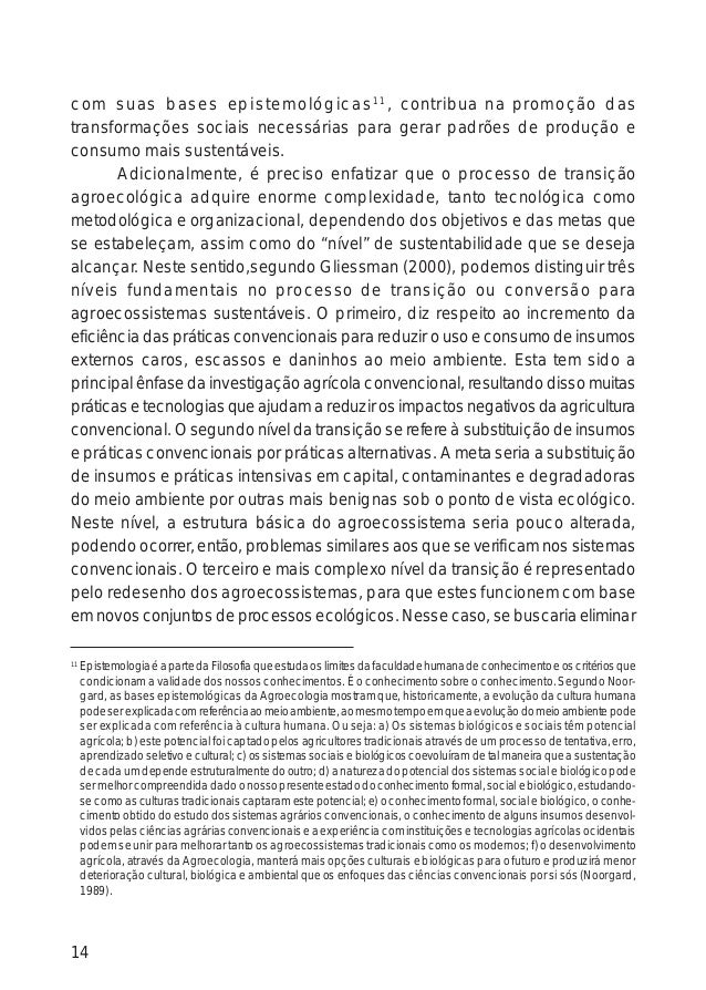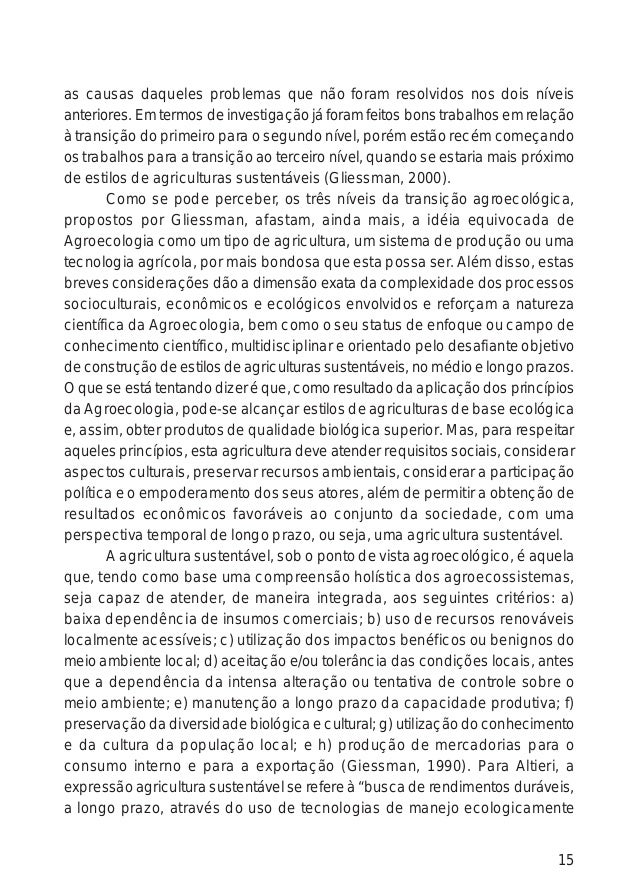 14. 14. 15 as causas daqueles problemas que não foram resolvidos nos dois níveis anteriores. Em termos de investigação já foram feitos bons trabalhos em relação à transição do primeiro para o segundo nível, porém estão recém começando os trabalhos para a transição ao terceiro nível, quando se estaria mais próximo de estilos de agriculturas sustentáveis (Gliessman, 2000). Como se pode perceber, os três níveis da transição agroecológica, propostos por Gliessman, afastam, ainda mais, a idéia equivocada de Agroecologia como um tipo de agricultura, um sistema de produção ou uma tecnologia agrícola, por mais bondosa que esta possa ser. Além disso, estas breves considerações dão a dimensão exata da complexidade dos processos socioculturais, econômicos e ecológicos envolvidos e reforçam a natureza científica da Agroecologia, bem como o seu status de enfoque ou campo de conhecimento científico, multidisciplinar e orientado pelo desafiante objetivo de construção de estilos de agriculturas sustentáveis, no médio e longo prazos. O que se está tentando dizer é que, como resultado da aplicação dos princípios da Agroecologia, pode-se alcançar estilos de agriculturas de base ecológica e, assim, obter produtos de qualidade biológica superior. Mas, para respeitar aqueles princípios, esta agricultura deve atender requisitos sociais, considerar aspectos culturais, preservar recursos ambientais, considerar a participação política e o empoderamento dos seus atores, além de permitir a obtenção de resultados econômicos favoráveis ao conjunto da sociedade, com uma perspectiva temporal de longo prazo, ou seja, uma agricultura sustentável. A agricultura sustentável, sob o ponto de vista agroecológico, é aquela que, tendo como base uma compreensão holística dos agroecossistemas, seja capaz de atender, de maneira integrada, aos seguintes critérios: a) baixa dependência de insumos comerciais; b) uso de recursos renováveis localmente acessíveis; c) utilização dos impactos benéficos ou benignos do meio ambiente local; d) aceitação e/ou tolerância das condições locais, antes que a dependência da intensa alteração ou tentativa de controle sobre o meio ambiente; e) manutenção a longo prazo da capacidade produtiva; f) preservação da diversidade biológica e cultural; g) utilização do conhecimento e da cultura da população local; e h) produção de mercadorias para o consumo interno e para a exportação (Giessman, 1990). Para Altieri, a expressão agricultura sustentável se refere à “busca de rendimentos duráveis, a longo prazo, através do uso de tecnologias de manejo ecologicamente