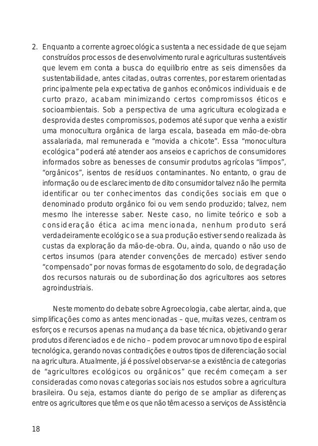 17. 17. 18 2. Enquanto a corrente agroecológica sustenta a necessidade de que sejam construídos processos de desenvolvimento rural e agriculturas sustentáveis que levem em conta a busca do equilíbrio entre as seis dimensões da sustentabilidade, antes citadas, outras correntes, por estarem orientadas principalmente pela expectativa de ganhos econômicos individuais e de curto prazo, acabam minimizando certos compromissos éticos e socioambientais. Sob a perspectiva de uma agricultura ecologizada e desprovida destes compromissos, podemos até supor que venha a existir uma monocultura orgânica de larga escala, baseada em mão-de-obra assalariada, mal remunerada e “movida a chicote”. Essa “monocultura ecológica” poderá até atender aos anseios e caprichos de consumidores informados sobre as benesses de consumir produtos agrícolas “limpos”, “orgânicos”, isentos de resíduos contaminantes. No entanto, o grau de informação ou de esclarecimento de dito consumidor talvez não lhe permita identificar ou ter conhecimentos das condições sociais em que o denominado produto orgânico foi ou vem sendo produzido; talvez, nem mesmo lhe interesse saber. Neste caso, no limite teórico e sob a consideração ética acima mencionada, nenhum produto será verdadeiramente ecológico se a sua produção estiver sendo realizada às custas da exploração da mão-de-obra. Ou, ainda, quando o não uso de certos insumos (para atender convenções de mercado) estiver sendo “compensado” por novas formas de esgotamento do solo, de degradação dos recursos naturais ou de subordinação dos agricultores aos setores agroindustriais. Neste momento do debate sobre Agroecologia, cabe alertar, ainda, que simplificações como as antes mencionadas – que, muitas vezes, centram os esforços e recursos apenas na mudança da base técnica, objetivando gerar produtos diferenciados e de nicho – podem provocar um novo tipo de espiral tecnológica, gerando novas contradições e outros tipos de diferenciação social na agricultura. Atualmente, já é possível observar-se a existência de categorias de “agricultores ecológicos ou orgânicos” que recém começam a ser consideradas como novas categorias sociais nos estudos sobre a agricultura brasileira. Ou seja, estamos diante do perigo de se ampliar as diferenças entre os agricultores que têm e os que não têm acesso a serviços de Assistência