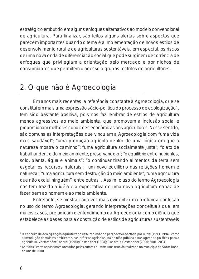 5. 5. 6 estratégico embutido em alguns enfoques alternativos ao modelo convencional de agricultura. Para finalizar, são feitos alguns alertas sobre aspectos que parecem importantes quando o tema é a implementação de novos estilos de desenvolvimento rural e de agriculturas sustentáveis, em especial, os riscos de uma nova onda de diferenciação social que pode surgir em decorrência de enfoques que privilegiam a orientação pelo mercado e por nichos de consumidores que permitem o acesso a grupos restritos de agricultores. 2. O que não é Agroecologia Em anos mais recentes, a referência constante à Agroecologia, que se constitui em mais uma expressão sócio-política do processo de ecologização2 , tem sido bastante positiva, pois nos faz lembrar de estilos de agricultura menos agressivos ao meio ambiente, que promovem a inclusão social e proporcionam melhores condições econômicas aos agricultores. Nesse sentido, são comuns as interpretações que vinculam a Agroecologia com “uma vida mais saudável”; “uma produção agrícola dentro de uma lógica em que a natureza mostra o caminho”; “uma agricultura socialmente justa”; “o ato de trabalhar dentro do meio ambiente, preservando-o”; “o equilíbrio entre nutrientes, solo, planta, água e animais”; “o continuar tirando alimentos da terra sem esgotar os recursos naturais”; “um novo equilíbrio nas relações homem e natureza”; “uma agricultura sem destruição do meio ambiente”; “uma agricultura que não exclui ninguém”; entre outras3 . Assim, o uso do termo Agroecologia nos tem trazido a idéia e a expectativa de uma nova agricultura capaz de fazer bem ao homem e ao meio ambiente. Entretanto, se mostra cada vez mais evidente uma profunda confusão no uso do termo Agroecologia, gerando interpretações conceituais que, em muitos casos, prejudicam o entendimento da Agroecologia como ciência que estabelece as bases para a construção de estilos de agriculturas sustentáveis 2 O conceito de ecologização aqui utilizado está inspirado na perspectiva adotada por Buttel (1993, 1994), como a introdução de valores ambientais nas práticas agrícolas, na opinião pública e nas agendas políticas para a agricultura. Ver também Caporal (1998); Costabeber (1998); Caporal e Costabeber (2000; 2001; 2004). 3 As “falas” entre aspas foram anotadas pelos autores durante uma reunião realizada no município de Santa Rosa, no ano de 2000.