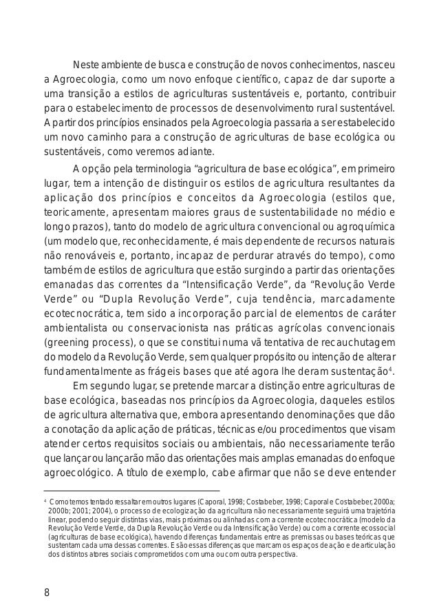 7. 7. 8 Neste ambiente de busca e construção de novos conhecimentos, nasceu a Agroecologia, como um novo enfoque científico, capaz de dar suporte a uma transição a estilos de agriculturas sustentáveis e, portanto, contribuir para o estabelecimento de processos de desenvolvimento rural sustentável. A partir dos princípios ensinados pela Agroecologia passaria a ser estabelecido um novo caminho para a construção de agriculturas de base ecológica ou sustentáveis, como veremos adiante. A opção pela terminologia “agricultura de base ecológica”, em primeiro lugar, tem a intenção de distinguir os estilos de agricultura resultantes da aplicação dos princípios e conceitos da Agroecologia (estilos que, teoricamente, apresentam maiores graus de sustentabilidade no médio e longo prazos), tanto do modelo de agricultura convencional ou agroquímica (um modelo que, reconhecidamente, é mais dependente de recursos naturais não renováveis e, portanto, incapaz de perdurar através do tempo), como também de estilos de agricultura que estão surgindo a partir das orientações emanadas das correntes da “Intensificação Verde”, da “Revolução Verde Verde” ou “Dupla Revolução Verde”, cuja tendência, marcadamente ecotecnocrática, tem sido a incorporação parcial de elementos de caráter ambientalista ou conservacionista nas práticas agrícolas convencionais (greening process), o que se constitui numa vã tentativa de recauchutagem do modelo da Revolução Verde, sem qualquer propósito ou intenção de alterar fundamentalmente as frágeis bases que até agora lhe deram sustentação4 . Em segundo lugar, se pretende marcar a distinção entre agriculturas de base ecológica, baseadas nos princípios da Agroecologia, daqueles estilos de agricultura alternativa que, embora apresentando denominações que dão a conotação da aplicação de práticas, técnicas e/ou procedimentos que visam atender certos requisitos sociais ou ambientais, não necessariamente terão que lançar ou lançarão mão das orientações mais amplas emanadas do enfoque agroecológico. A título de exemplo, cabe afirmar que não se deve entender 4 Como temos tentado ressaltar em outros lugares (Caporal, 1998; Costabeber, 1998; Caporal e Costabeber, 2000a; 2000b; 2001; 2004), o processo de ecologização da agricultura não necessariamente seguirá uma trajetória linear, podendo seguir distintas vias, mais próximas ou alinhadas com a corrente ecotecnocrática (modelo da Revolução Verde Verde, da Dupla Revolução Verde ou da Intensificação Verde) ou com a corrente ecossocial (agriculturas de base ecológica), havendo diferenças fundamentais entre as premissas ou bases teóricas que sustentam cada uma dessas correntes. E são essas diferenças que marcam os espaços de ação e de articulação dos distintos atores sociais comprometidos com uma ou com outra perspectiva.