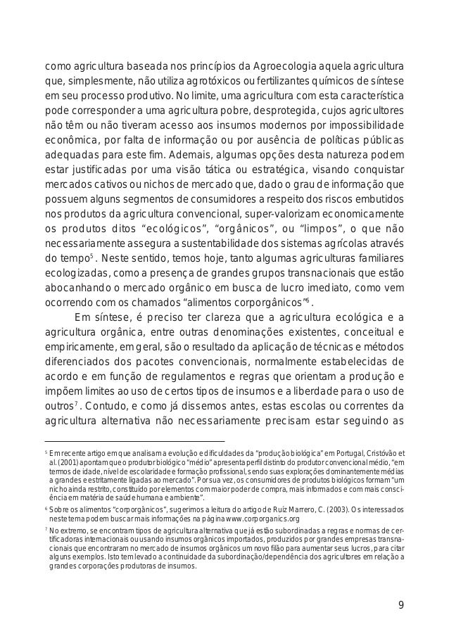8. 8. 9 como agricultura baseada nos princípios da Agroecologia aquela agricultura que, simplesmente, não utiliza agrotóxicos ou fertilizantes químicos de síntese em seu processo produtivo. No limite, uma agricultura com esta característica pode corresponder a uma agricultura pobre, desprotegida, cujos agricultores não têm ou não tiveram acesso aos insumos modernos por impossibilidade econômica, por falta de informação ou por ausência de políticas públicas adequadas para este fim. Ademais, algumas opções desta natureza podem estar justificadas por uma visão tática ou estratégica, visando conquistar mercados cativos ou nichos de mercado que, dado o grau de informação que possuem alguns segmentos de consumidores a respeito dos riscos embutidos nos produtos da agricultura convencional, super-valorizam economicamente os produtos ditos “ecológicos”, “orgânicos”, ou “limpos”, o que não necessariamente assegura a sustentabilidade dos sistemas agrícolas através do tempo5 . Neste sentido, temos hoje, tanto algumas agriculturas familiares ecologizadas, como a presença de grandes grupos transnacionais que estão abocanhando o mercado orgânico em busca de lucro imediato, como vem ocorrendo com os chamados “alimentos corporgânicos”6 . Em síntese, é preciso ter clareza que a agricultura ecológica e a agricultura orgânica, entre outras denominações existentes, conceitual e empiricamente, em geral, são o resultado da aplicação de técnicas e métodos diferenciados dos pacotes convencionais, normalmente estabelecidas de acordo e em função de regulamentos e regras que orientam a produção e impõem limites ao uso de certos tipos de insumos e a liberdade para o uso de outros7 . Contudo, e como já dissemos antes, estas escolas ou correntes da agricultura alternativa não necessariamente precisam estar seguindo as 5 Em recente artigo em que analisam a evolução e dificuldades da “produção biológica” em Portugal, Cristóvão et al. (2001) apontam que o produtor biológico “médio” apresenta perfil distinto do produtor convencional médio, “em termos de idade, nível de escolaridade e formação profissional, sendo suas explorações dominantemente médias a grandes e estritamente ligadas ao mercado”. Por sua vez, os consumidores de produtos biológicos formam “um nicho ainda restrito, constituído por elementos com maior poder de compra, mais informados e com mais consci- ência em matéria de saúde humana e ambiente”. 6 Sobre os alimentos “corporgânicos”, sugerimos a leitura do artigo de Ruíz Marrero, C. (2003). Os interessados neste tema podem buscar mais informações na página www.corporganics.org 7 No extremo, se encontram tipos de agricultura alternativa que já estão subordinadas a regras e normas de cer- tificadoras internacionais ou usando insumos orgânicos importados, produzidos por grandes empresas transna- cionais que encontraram no mercado de insumos orgânicos um novo filão para aumentar seus lucros, para citar alguns exemplos. Isto tem levado a continuidade da subordinação/dependência dos agricultores em relação a grandes corporações produtoras de insumos.