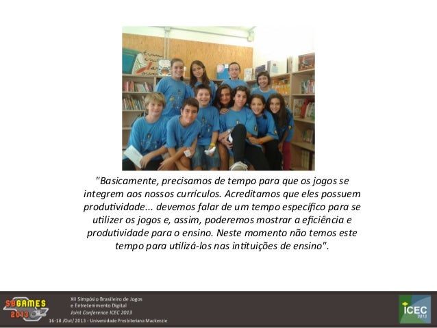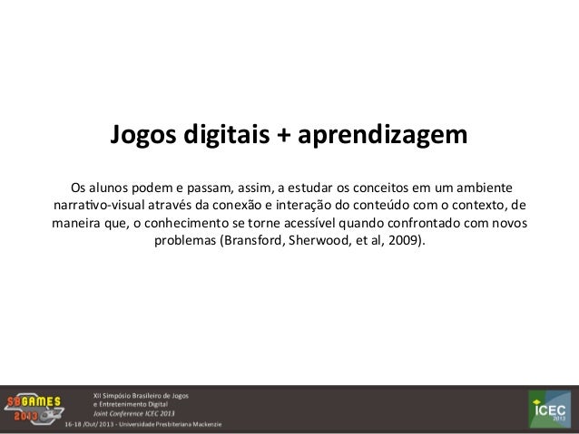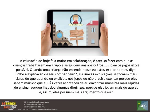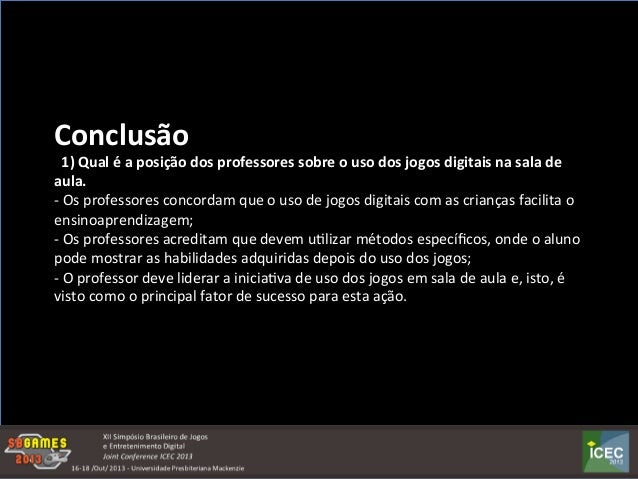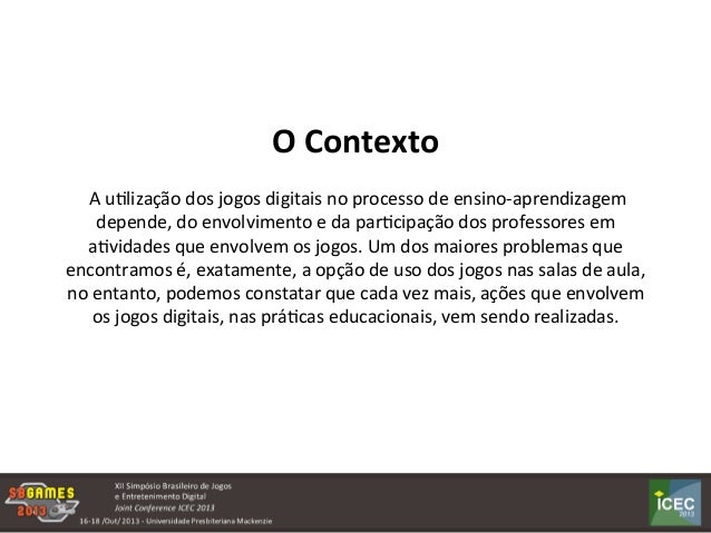 A utilização dos jogos digitais no processo de ensino-aprendizagemdepende, do envolvimento e da participação dos professores em atividades que envolvem os jogos. Um dos maiores problemas que encontramos é, exatamente, a opção de uso dos jogos nas salas de aula, no entanto, podemos constatar que cada vez mais, ações que envolvem os jogos digitais, nas práticas educacionais, vem sendo realizadas. Objetivo principal: Identificar, através de análises de entrevistas com professores, quais são as estratégias utilizadas na organização de atividades em salade aula que levam em consideração os jogos digitais.