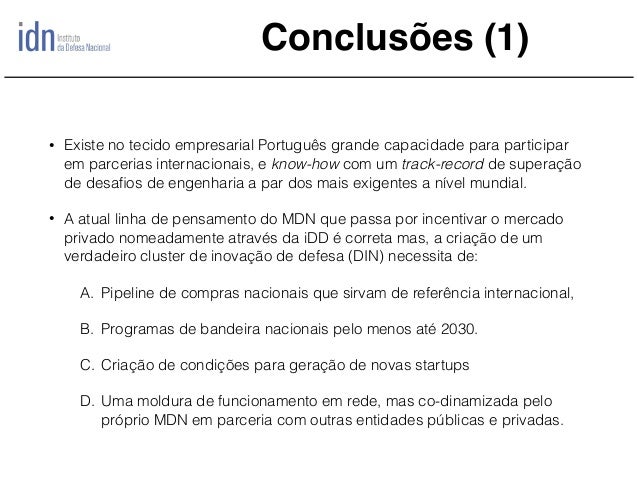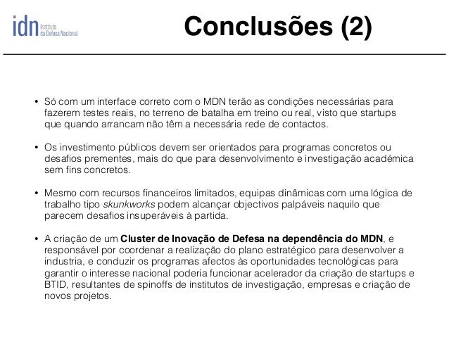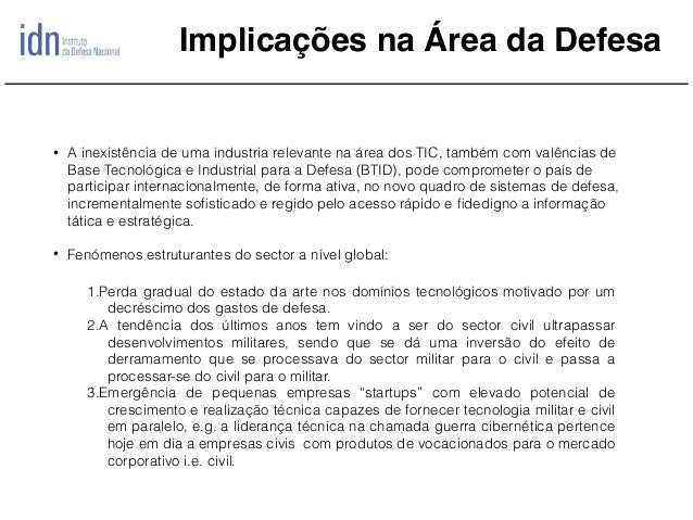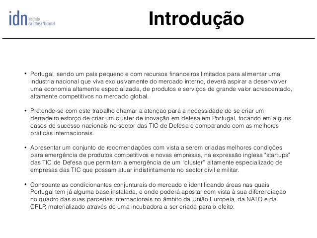 Temos vindo a assistir em Portugal ao desenvolvimento de um conjunto de empresas nas áreas das Tecnologias de Informação e Comunicação (TIC) que de acordo com a ACEPI (Associação da Economia Digital) no seu agregado em 2013 representavam 4,5% do PIB nacional, sendo que o perfil de exportações portuguesas reflete também uma tendência de progressiva consolidação dos sectores de média e elevada intensidade tecnológica. Não obstante, uma das principais limitações ao desenvolvimento deste sector tem a ver com a dificuldade das empresas nacionais em desenvolver produtos de elevada densidade tecnológica, exportáveis e por isso competitivos. No quadro atual as empresas TIC nacionais são ainda muito dependentes de desenvolvimento de soluções e serviços e por isso com custos marginais muito elevados, e portanto dificilmente escaláveis. Pretende-se com este trabalho fazer uma análise de caso, focando em alguns casos de sucesso nacionais no sector das TIC de Defesa e comparando com as melhores práticas internacionais e formulando assim, um conjunto de conclusões com vista a serem criadas melhores condições para emergência de produtos competitivos e novas empresas, na expressão inglesa "startups" das TIC de Defesa que permitam a emergência de um “cluster” altamente especializado de empresas das TIC que possam atuar indistintamente no sector civil e militar, consoante as condicionantes conjunturais do mercado e identificando áreas nas quais Portugal tem já alguma base instalada, e onde poderá apostar com vista à sua diferenciação no quadro das suas parcerias internacionais no âmbito da União Europeia, da NATO e da CPLP.