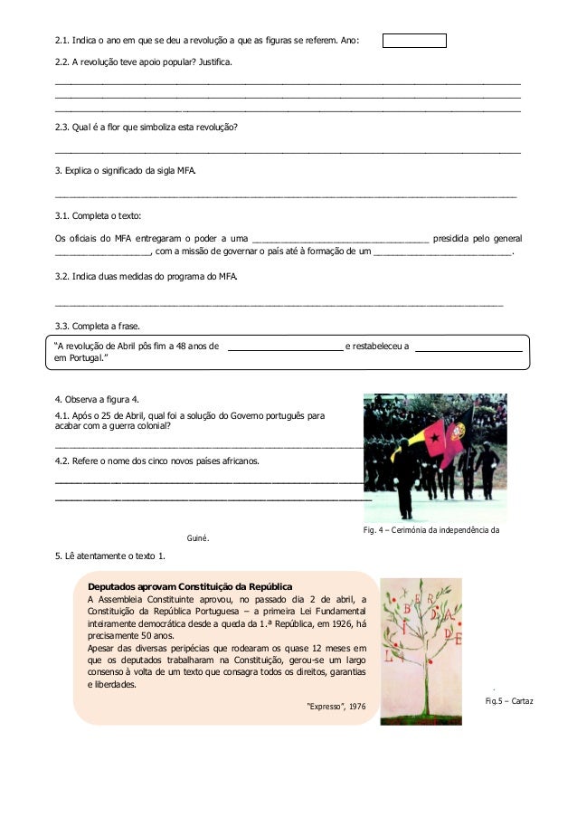 2. 2. 2.1. Indica o ano em que se deu a revolução a que as figuras se referem. Ano:2.2. A revolução teve apoio popular? Justifica.________________________________________________________________________________________________________________________________________________________________________________________________________________________________________________________________________2.3. Qual é a flor que simboliza esta revolução?________________________________________________________________________________________3. Explica o significado da sigla MFA._________________________________________________________________________________________________3.1. Completa o texto:Os oficiais do MFA entregaram o poder a uma _____________________________________ presidida pelo general____________________, com a missão de governar o país até à formação de um _____________________________.3.2. Indica duas medidas do programa do MFA.______________________________________________________________________________________________3.3. Completa a frase.4. Observa a figura 4.4.1. Após o 25 de Abril, qual foi a solução do Governo português paraacabar com a guerra colonial?__________________________________________________________________4.2. Refere o nome dos cinco novos países africanos.__________________________________________________________________________________________________________________Fig. 4 – Cerimónia da independência daGuiné.5. Lê atentamente o texto 1..“A revolução de Abril pôs fim a 48 anos de e restabeleceu aem Portugal.”Deputados aprovam Constituição da RepúblicaA Assembleia Constituinte aprovou, no passado dia 2 de abril, aConstituição da República Portuguesa – a primeira Lei Fundamentalinteiramente democrática desde a queda da 1.ª República, em 1926, háprecisamente 50 anos.Apesar das diversas peripécias que rodearam os quase 12 meses emque os deputados trabalharam na Constituição, gerou-se um largoconsenso à volta de um texto que consagra todos os direitos, garantiase liberdades.“Expresso”, 1976Fig.5 – Cartaz