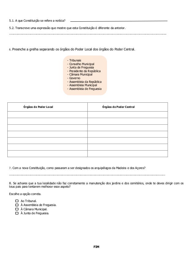 3. 3. 5.1. A que Constituição se refere a notícia?5.2. Transcreve uma expressão que mostre que esta Constituição é diferente da anterior.______________________________________________________________________________________________________________6. Preenche a grelha separando os órgãos do Poder Local dos órgãos do Poder Central.7. Com a nova Constituição, como passaram a ser designados os arquipélagos da Madeira e dos Açores?_____________________________________________________________________________________________________________8. Se achares que a tua localidade não faz corretamente a manutenção dos jardins e dos cemitérios, onde te deves dirigir com osteus pais para tentarem melhorar esse aspeto?Escolhe a opção correta. Ao Tribunal. À Assembleia de Freguesia. À Câmara Municipal. À Junta de Freguesia.FIMÓrgãos do Poder Local Órgãos do Poder Central- Tribunais- Conselho Municipal- Junta de Freguesia- Presidente da República- Câmara Municipal- Governo- Assembleia da República- Assembleia Municipal- Assembleia de Freguesia