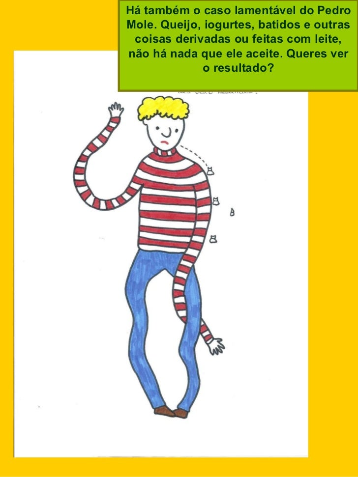 5. 5. Há também o caso lamentável do Pedro Mole. Queijo, iogurtes, batidos e outras coisas derivadas ou feitas com leite, não há nada que ele aceite. Queres ver o resultado?