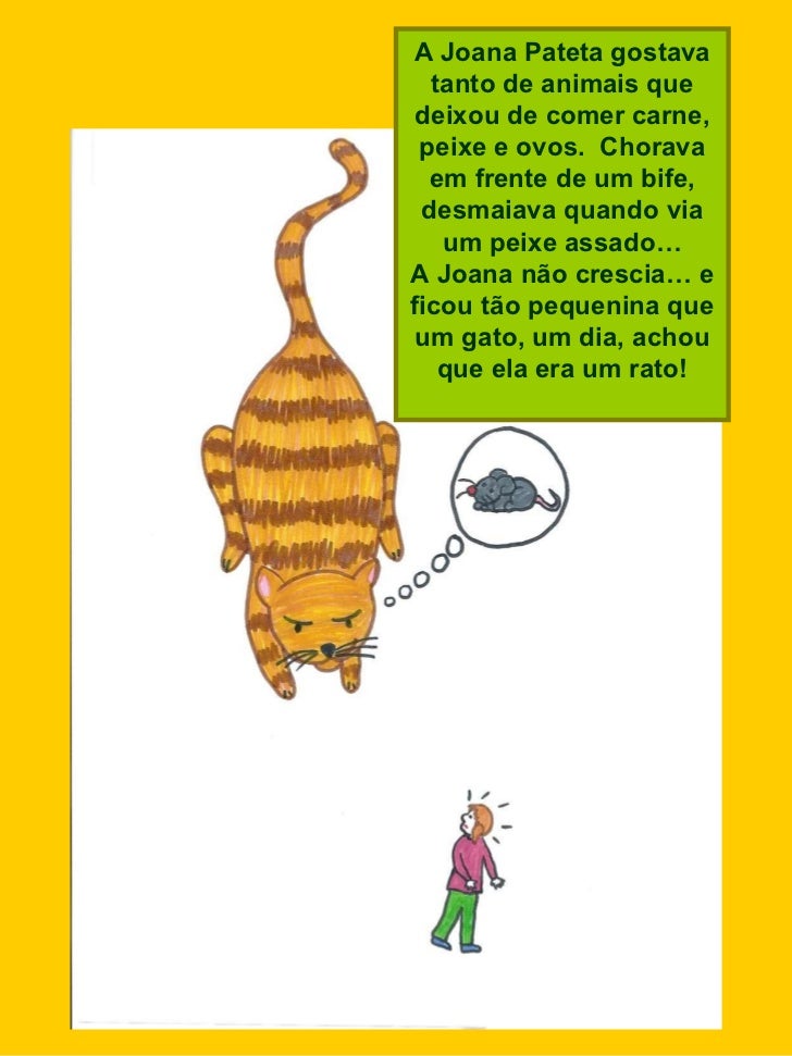 6. 6. A Joana Pateta gostava tanto de animais que deixou de comer carne, peixe e ovos. Chorava em frente de um bife, desmaiava quando via um peixe assado… A Joana não crescia… e ficou tão pequenina que um gato, um dia, achou que ela era um rato!