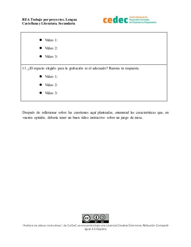 2. 2. REA Trabajo por proyectos.Lengua Castellana y Literatura. Secundaria “Análisis de vídeos instructivos”,de CeDeC se encuentra bajo una Licencia Creative Commons Atribución-Compartir Igual 4.0 España  Vídeo 1:  Vídeo 2:  Vídeo 3: 11. ¿El espacio elegido para la grabación es el adecuado? Razona tu respuesta.  Vídeo 1:  Vídeo 2:  Vídeo 3: Después de reflexionar sobre las cuestiones aquí planteadas, enumerad las características que, en vuestra opinión, debería tener un buen vídeo instructivo sobre un juego de mesa.