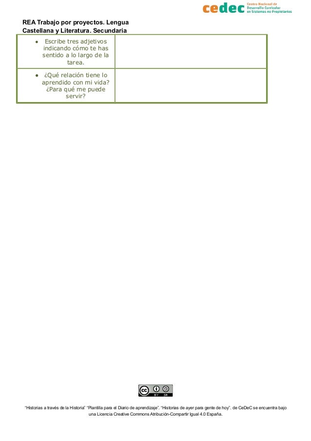 2. 2. REA Trabajo por proyectos. Lengua Castellana y Literatura. Secundaria ● Escribe tres adjetivos indicando cómo te has sentido a lo largo de la tarea. ● ¿Qué relación tiene lo aprendido con mi vida? ¿Para qué me puede servir? “Historias a través de la Historia” “Plantilla para el Diario de aprendizaje”. “Historias de ayer para gente de hoy”. de CeDeC se encuentra bajo una Licencia Creative Commons Atribución-Compartir Igual 4.0 España.