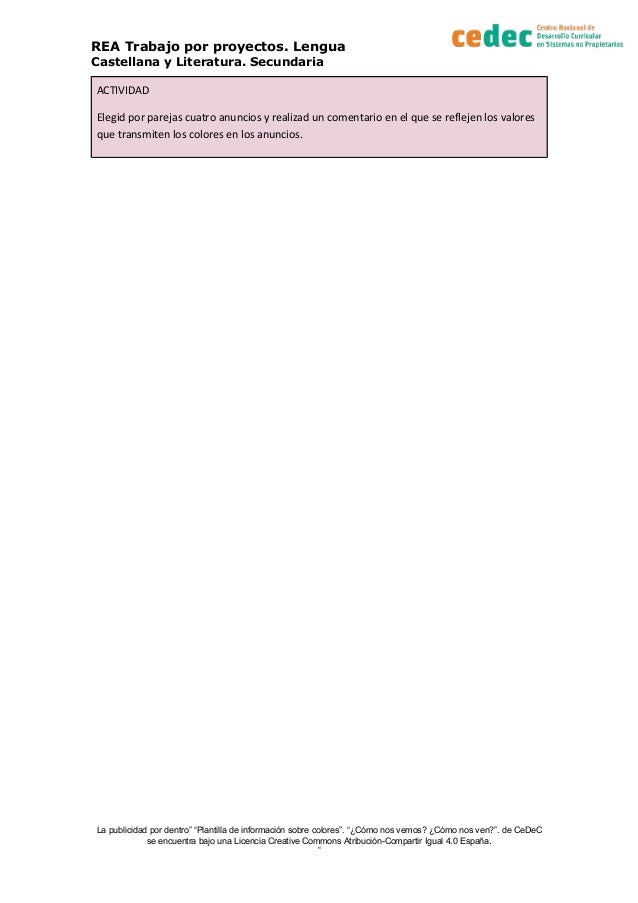 2. 2. REA Trabajo por proyectos. Lengua Castellana y Literatura. Secundaria ACTIVIDAD Elegid por parejas cuatro anuncios y realizad un comentario en el que se reflejen los valores que transmiten los colores en los anuncios. La publicidad por dentro” “Plantilla de información sobre colores”. “¿Cómo nos vemos? ¿Cómo nos ven?”. de CeDeC se encuentra bajo una Licencia Creative Commons Atribución-Compartir Igual 4.0 España. “