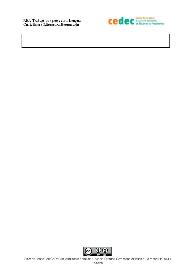 2. 2. REA Trabajo por proyectos.Lengua Castellana y Literatura. Secundaria “Recapitulando”,de CeDeC se encuentra bajo una Licencia Creative Commons Atribución-Compartir Igual 4.0 España