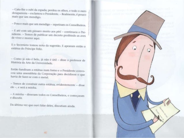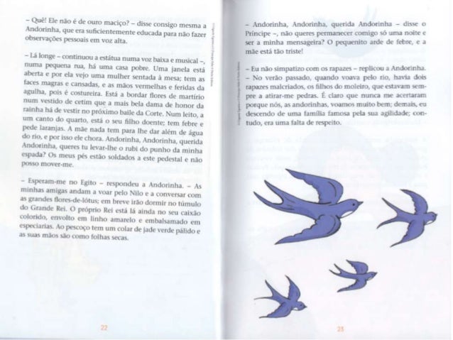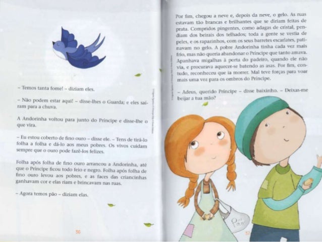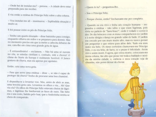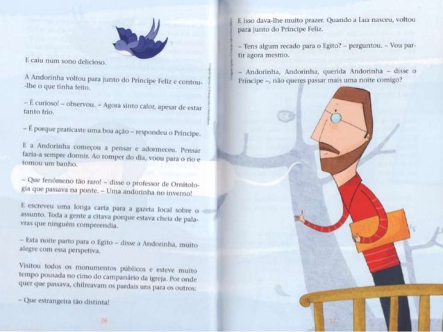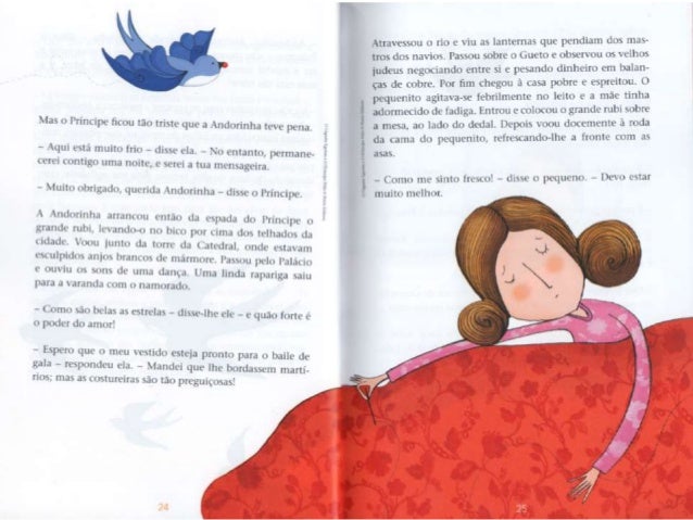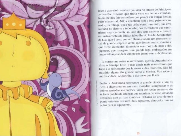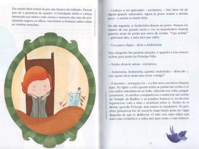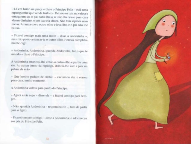 5. 5. - Quéf llle não é de ouro maciço? - disse consigo mesma . i Andorinha. que em suficientemente educada para nim fazer observações ¡x-ssoais em voz alta. - Lá lrsnge - continuou . i estatua numa m¡ luis. : v: musical -, num¡ pequena ma, há um. : (as. : rxwbrc. Um. : janela esta aberta e por ela vein uma mulher sentada a mesa; tem as faces magras e causadas, o . is mãos vermelhas e lendas da agulha, pois (- costureira. Está . i bordar dores de martírio num vestido dc cetim que a mais bela dum. : de honor da rainha ha de xcstir no próximo baile da Corte. Num leito. .l um canto du quarto, est. ; u . seu filho Lim-nte: tem febre c pede Iaranias. A mac nada tem para lhe dar alem de água do rio, o: por isso ele Chora. Anciurinha. Andorinha, querida Andorinha, queres tu lcvqiplht' o rubi du punho da minha espada? Os meus pés estão soldados . i este pedestal c nao posso mover-mu. - ihspemm-me no ! agito - respondeu . i Andorinha. - . s minhas amigas andam a voar pelo Nilo e a conversar com as grandes llorcsAc-loius; em brcx e irão dormir no túmulo do Gnndc Rca. O próprio Rui está la' ainda no seu caixão colorido. envolto cm linho amarelo e embaluimadr) em asspccurias. .o pescoço tem um colar de ¡adc wrdc [LÍHÓO L' as suas mãos são como folhas secas. _ . ~ ~ , rnha - disse o - Andorinha, Àndoflnhd- *Wma* *"*_*°' _ nohcú Princiliv: -. nào queres P°mHn°VÚ '5°'“'S° m “tab . , s 1 o *qucnitn . irdc da: - c- rt. L' J ser . i minha mcnsagura. px mãe está tün M5193 - l-. u não simPülizo com os UNB” ' “Tüícou a 'mdormhlf' - No verão passado, quando om avpelo no, han. : rapazes maluiados, os filhos do moieiro, que estaxarptnêlm Pre : i ; itimr-me pedra*- L da") que "Emíehlf : :na cu pomue mas, as JHÓOFÍDÍIIIS, xoamos muito dkdj_ descendo de uma família famosa pela su. : 4), ' ¡ J *- mdg, cra um. : Lilia de ! espum-