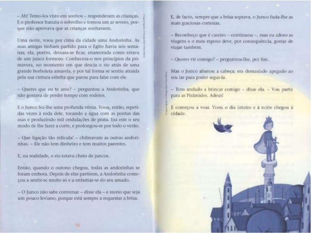 3. 3. - Ah! Temo-los visto em sonhos - responderam as crianças. E o professor franzlu o sobrolho e tomou um ar severo, por- que não aprovava que as crianças sonhassem. Uma noite, voou por cima da cidade uma Andorinha. As suas amigas tinham partido para o Egito havia seis sema- nas; ela, porém, deixarzrse ñcar, enamorada como estava de um ¡unco formosa. conhecem-o nos princípios da prí- mavera, no momento em que descia o no atrás de uma grande borboleta amarela, e por tal forma se sentiu atraída pela sua cintura esbelta que parou para lala: com ele. - Queres que eu te ame? - perguntou a Andorinha, que não gostava de perder tempo com rodeios. E o Junco fez-lhe uma profunda vénia. Voou, então, repeti- das vezes ã roda dele. tocando a água com as pontas das asas e produzindo mil ondulações de prata. Era este o seu modo de lhe fazer a corte, e prolongou-se por todo o verão. - Que ligaçao tao ridícula! - chllreavam as outras andorl- nhas. - Ele nao tem dinheiro e tem muitos parentes. E, na realidade, o rlo estava cheio de Juncos. Entao, quando o outono chepu, todas as : Andorinhas se foram embora. Depois de elas partlrem. a Andorinha come- çou a sentimos multo só e a enfastlar-se do seu amado. - O Junco não sabe conversar - disse ela - e receio que seia um pouco leviano, porque está sempre a requestar a brisa. 10 . .., ... ... ..-. -.-. .,. ,.. .a-. .~. .. E, de facto, sempre que a brisa soprava, o Junco fazia-lhe as mais graciosa: corteslas. - Reconheço que e' caseiro - contlnuou -. mas eu adoro as viagens e o meu esposo deve, por consequênda, gostar de vlahr também. - Queres vir comigo? - perguntou-lhe. por tim. Mas o Junco abanou a cabeca; era demasiado apegado ao seu lar para poder segui-la. -Tensarldadonbrlmarcomlgo-dlsseda-Vmpartír panasPlrâmldesJldeus! Ecomeçouavoanvoouodlalmelroeànoitechegouà lacrado_