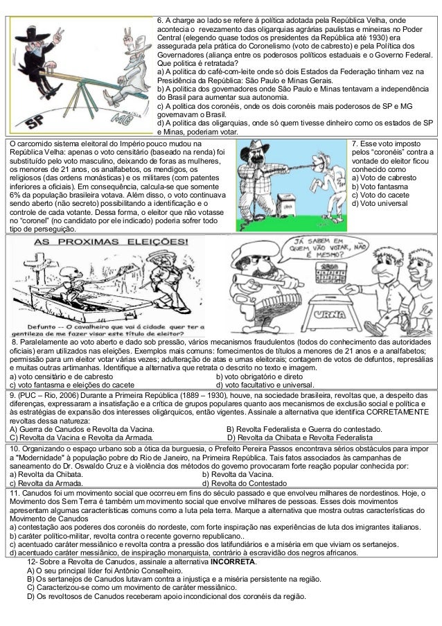 2. 2. 6. A charge ao lado se refere á política adotada pela República Velha, onde acontecia o revezamento das oligarquias agrárias paulistas e mineiras no Poder Central (elegendo quase todos os presidentes da República até 1930) era assegurada pela prática do Coronelismo (voto de cabresto) e pela Política dos Governadores (aliança entre os poderosos políticos estaduais e o Governo Federal. Que politica é retratada? a) A politica do café-com-leite onde só dois Estados da Federação tinham vez na Presidência da República: São Paulo e Minas Gerais. b) A politica dos governadores onde São Paulo e Minas tentavam a independência do Brasil para aumentar sua autonomia. c) A politica dos coronéis, onde os dois coronéis mais poderosos de SP e MG governavam o Brasil. d) A politica das oligarquias, onde só quem tivesse dinheiro como os estados de SP e Minas, poderiam votar. O carcomido sistema eleitoral do Império pouco mudou na República Velha: apenas o voto censitário (baseado na renda) foi substituído pelo voto masculino, deixando de foras as mulheres, os menores de 21 anos, os analfabetos, os mendigos, os religiosos (das ordens monásticas) e os militares (com patentes inferiores a oficiais). Em consequência, calcula-se que somente 6% da população brasileira votava. Além disso, o voto continuava sendo aberto (não secreto) possibilitando a identificação e o controle de cada votante. Dessa forma, o eleitor que não votasse no “coronel” (no candidato por ele indicado) poderia sofrer todo tipo de perseguição. 7. Esse voto imposto pelos “coronéis” contra a vontade do eleitor ficou conhecido como a) Voto de cabresto b) Voto fantasma c) Voto do cacete d) Voto universal 8. Paralelamente ao voto aberto e dado sob pressão, vários mecanismos fraudulentos (todos do conhecimento das autoridades oficiais) eram utilizados nas eleições. Exemplos mais comuns: fornecimentos de títulos a menores de 21 anos e a analfabetos; permissão para um eleitor votar várias vezes; adulteração de atas e urnas eleitorais; contagem de votos de defuntos, represálias e muitas outras artimanhas. Identifique a alternativa que retrata o descrito no texto e imagem. a) voto censitário e de cabresto b) voto obrigatório e direto c) voto fantasma e eleições do cacete d) voto facultativo e universal. 9. (PUC – Rio, 2006) Durante a Primeira República (1889 – 1930), houve, na sociedade brasileira, revoltas que, a despeito das diferenças, expressaram a insatisfação e a crítica de grupos populares quanto aos mecanismos de exclusão social e política e às estratégias de expansão dos interesses oligárquicos, então vigentes. Assinale a alternativa que identifica CORRETAMENTE revoltas dessa natureza: A) Guerra de Canudos e Revolta da Vacina. B) Revolta Federalista e Guerra do contestado. C) Revolta da Vacina e Revolta da Armada. D) Revolta da Chibata e Revolta Federalista 10. Organizando o espaço urbano sob a ótica da burguesia, o Prefeito Pereira Passos encontrava sérios obstáculos para impor a "Modernidade" à população pobre do Rio de Janeiro, na Primeira República. Tais fatos associados às campanhas de saneamento do Dr. Oswaldo Cruz e à violência dos métodos do governo provocaram forte reação popular conhecida por: a) Revolta da Chibata. b) Revolta da Vacina. c) Revolta da Armada. d) Revolta do Contestado 11. Canudos foi um movimento social que ocorreu em fins do século passado e que envolveu milhares de nordestinos. Hoje, o Movimento dos Sem Terra é também um movimento social que envolve milhares de pessoas. Esses dois movimentos apresentam algumas características comuns como a luta pela terra. Marque a alternativa que mostra outras características do Movimento de Canudos a) contestação aos poderes dos coronéis do nordeste, com forte inspiração nas experiências de luta dos imigrantes italianos. b) caráter político-militar, revolta contra o recente governo republicano.. c) acentuado caráter messiânico e revolta contra a pressão dos latifundiários e a miséria em que viviam os sertanejos. d) acentuado caráter messiânico, de inspiração monarquista, contrário à escravidão dos negros africanos. 12- Sobre a Revolta de Canudos, assinale a alternativa INCORRETA. A) O seu principal líder foi Antônio Conselheiro. B) Os sertanejos de Canudos lutavam contra a injustiça e a miséria persistente na região. C) Caracterizou-se como um movimento de caráter messiânico. D) Os revoltosos de Canudos receberam apoio incondicional dos coronéis da região.