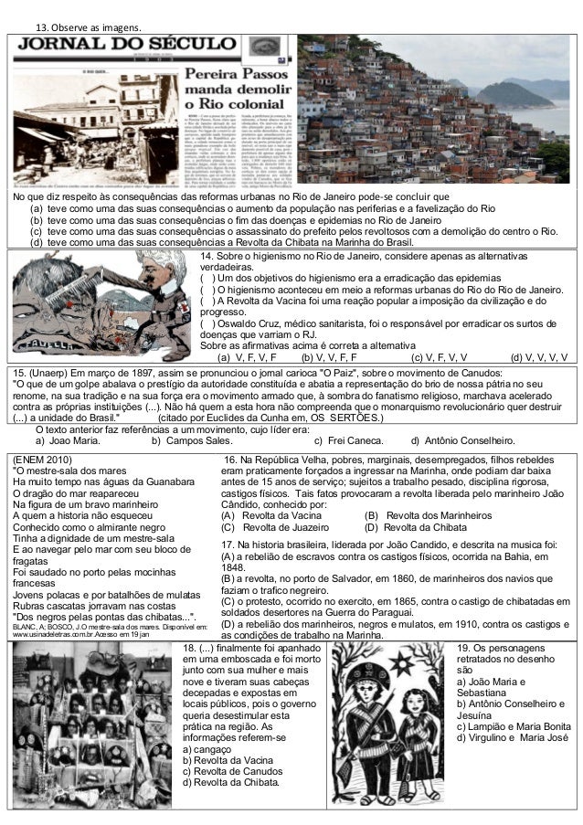 3. 3. 13. Observe as imagens. No que diz respeito às consequências das reformas urbanas no Rio de Janeiro pode-se concluir que (a) teve como uma das suas consequências o aumento da população nas periferias e a favelização do Rio (b) teve como uma das suas consequências o fim das doenças e epidemias no Rio de Janeiro (c) teve como uma das suas consequências o assassinato do prefeito pelos revoltosos com a demolição do centro o Rio. (d) teve como uma das suas consequências a Revolta da Chibata na Marinha do Brasil. 14. Sobre o higienismo no Rio de Janeiro, considere apenas as alternativas verdadeiras. ( ) Um dos objetivos do higienismo era a erradicação das epidemias ( ) O higienismo aconteceu em meio a reformas urbanas do Rio do Rio de Janeiro. ( ) A Revolta da Vacina foi uma reação popular a imposição da civilização e do progresso. ( ) Oswaldo Cruz, médico sanitarista, foi o responsável por erradicar os surtos de doenças que varriam o RJ. Sobre as afirmativas acima é correta a alternativa (a) V, F, V, F (b) V, V, F, F (c) V, F, V, V (d) V, V, V, V 15. (Unaerp) Em março de 1897, assim se pronunciou o jornal carioca "O Paiz", sobre o movimento de Canudos: "O que de um golpe abalava o prestígio da autoridade constituída e abatia a representação do brio de nossa pátria no seu renome, na sua tradição e na sua força era o movimento armado que, à sombra do fanatismo religioso, marchava acelerado contra as próprias instituições (...). Não há quem a esta hora não compreenda que o monarquismo revolucionário quer destruir (...) a unidade do Brasil." (citado por Euclides da Cunha em, OS SERTÕES.) O texto anterior faz referências a um movimento, cujo líder era: a) Joao Maria. b) Campos Sales. c) Frei Caneca. d) Antônio Conselheiro. (ENEM 2010) "O mestre-sala dos mares Ha muito tempo nas águas da Guanabara O dragão do mar reapareceu Na figura de um bravo marinheiro A quem a historia não esqueceu Conhecido como o almirante negro Tinha a dignidade de um mestre-sala E ao navegar pelo mar com seu bloco de fragatas Foi saudado no porto pelas mocinhas francesas Jovens polacas e por batalhões de mulatas Rubras cascatas jorravam nas costas "Dos negros pelas pontas das chibatas...". BLANC, A; BOSCO, J.O mestre-sala dos mares. Disponível em: www.usinadeletras.com.br.Acesso em 19 jan 16. Na República Velha, pobres, marginais, desempregados, filhos rebeldes eram praticamente forçados a ingressar na Marinha, onde podiam dar baixa antes de 15 anos de serviço; sujeitos a trabalho pesado, disciplina rigorosa, castigos físicos. Tais fatos provocaram a revolta liberada pelo marinheiro João Cândido, conhecido por: (A) Revolta da Vacina (B) Revolta dos Marinheiros (C) Revolta de Juazeiro (D) Revolta da Chibata 17. Na historia brasileira, liderada por João Candido, e descrita na musica foi: (A) a rebelião de escravos contra os castigos físicos, ocorrida na Bahia, em 1848. (B) a revolta, no porto de Salvador, em 1860, de marinheiros dos navios que faziam o trafico negreiro. (C) o protesto, ocorrido no exercito, em 1865, contra o castigo de chibatadas em soldados desertores na Guerra do Paraguai. (D) a rebelião dos marinheiros, negros e mulatos, em 1910, contra os castigos e as condições de trabalho na Marinha. 18. (...) finalmente foi apanhado em uma emboscada e foi morto junto com sua mulher e mais nove e tiveram suas cabeças decepadas e expostas em locais públicos, pois o governo queria desestimular esta prática na região. As informações referem-se a) cangaço b) Revolta da Vacina c) Revolta de Canudos d) Revolta da Chibata. 19. Os personagens retratados no desenho são a) João Maria e Sebastiana b) Antônio Conselheiro e Jesuína c) Lampião e Maria Bonita d) Virgulino e Maria José