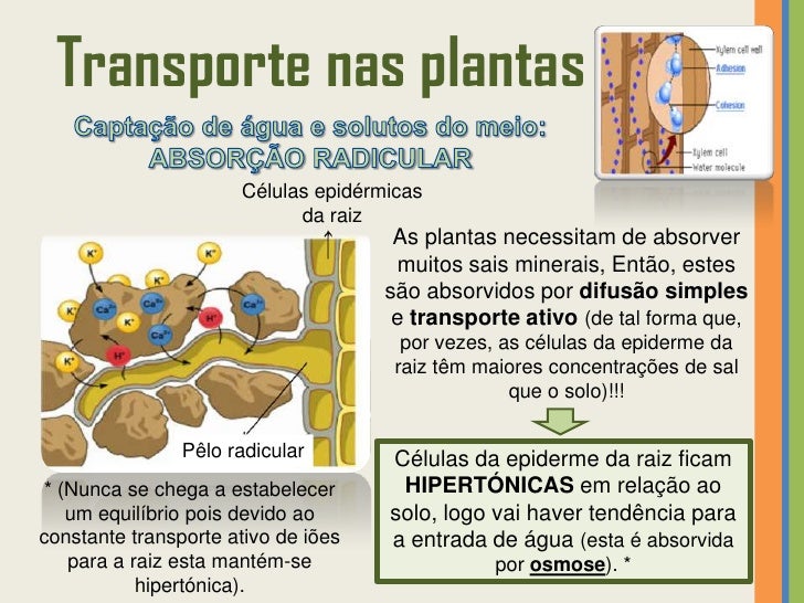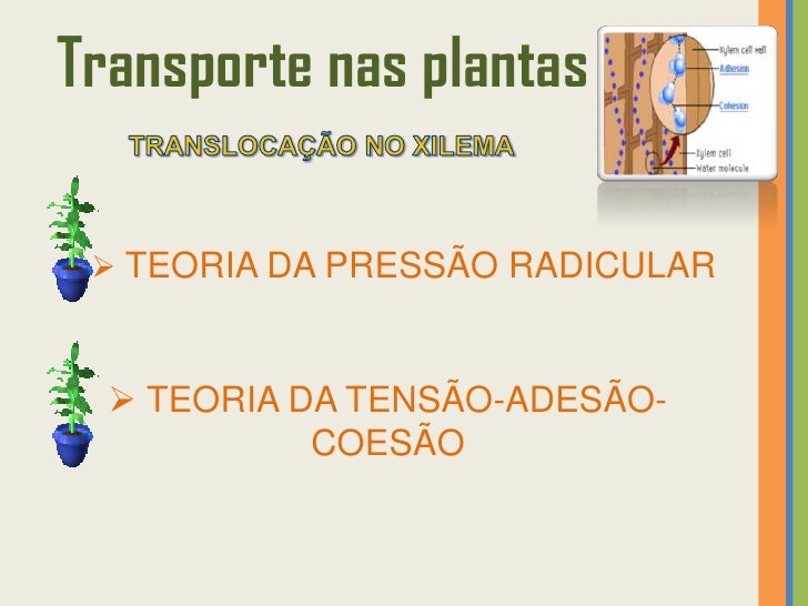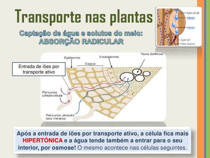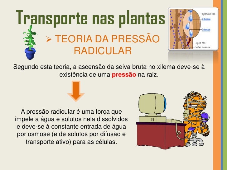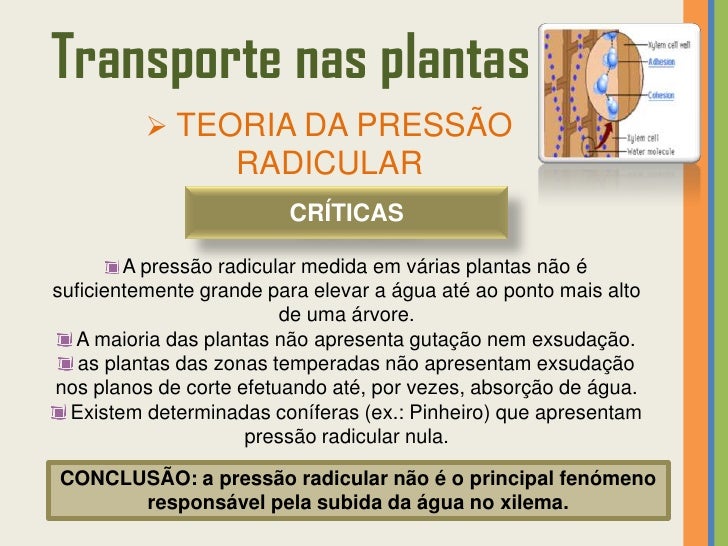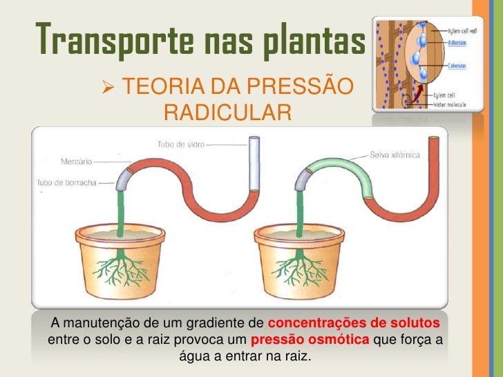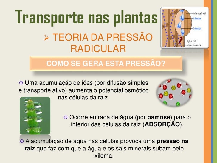 27. 27. Transporte nas plantas  TEORIA DA PRESSÃO RADICULARSegundo esta teoria, a ascensão da seiva bruta no xilema deve-se à existência de uma pressão na raiz. A pressão radicular é uma força queimpele a água e solutos nela dissolvidos e deve-se à constante entrada de água por osmose (e de solutos por difusão e transporte ativo) para as células.